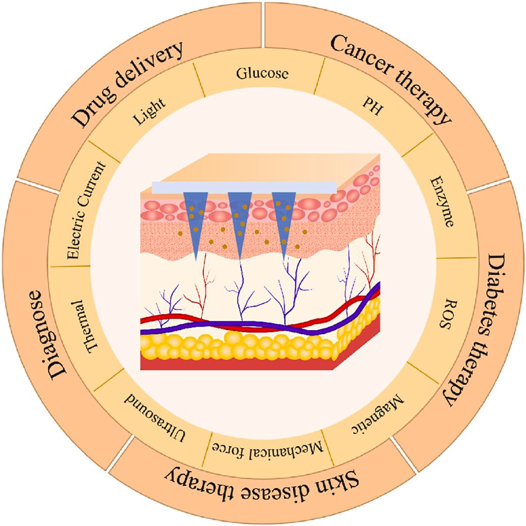 تصویر1. این تصویر توانایی‌های نوآورانه‌ی فناوری میکرونیدل‌های هوشمند را به نمایش می‌گذارد و کاربردهای گستردهٔ آن را در زمینهٔ دارورسانی هدفمند، تشخیص بیماری و درمان‌های متنوع نشان می‌دهد. تمامی این عملکردها تحت کنترل محرک‌های داخلی و خارجی مختلف صورت می‌گیرند.